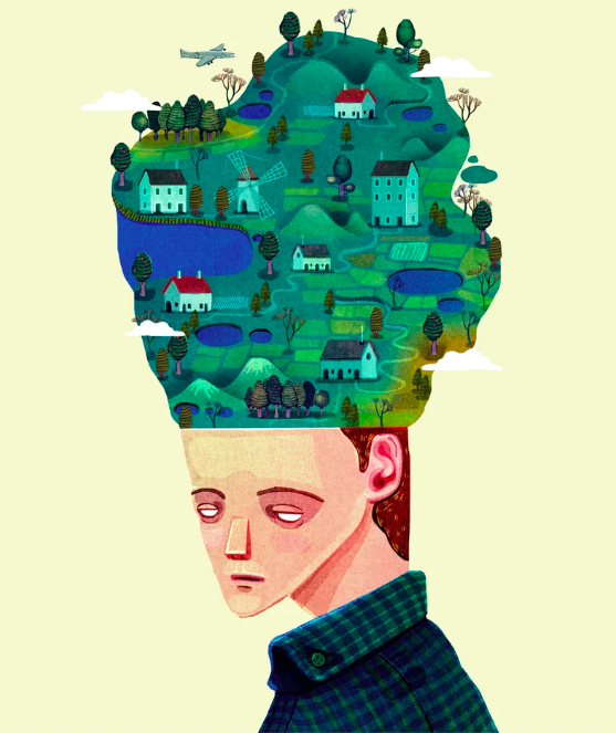 Ilustração de homem com paisagem na cabeça aberta
