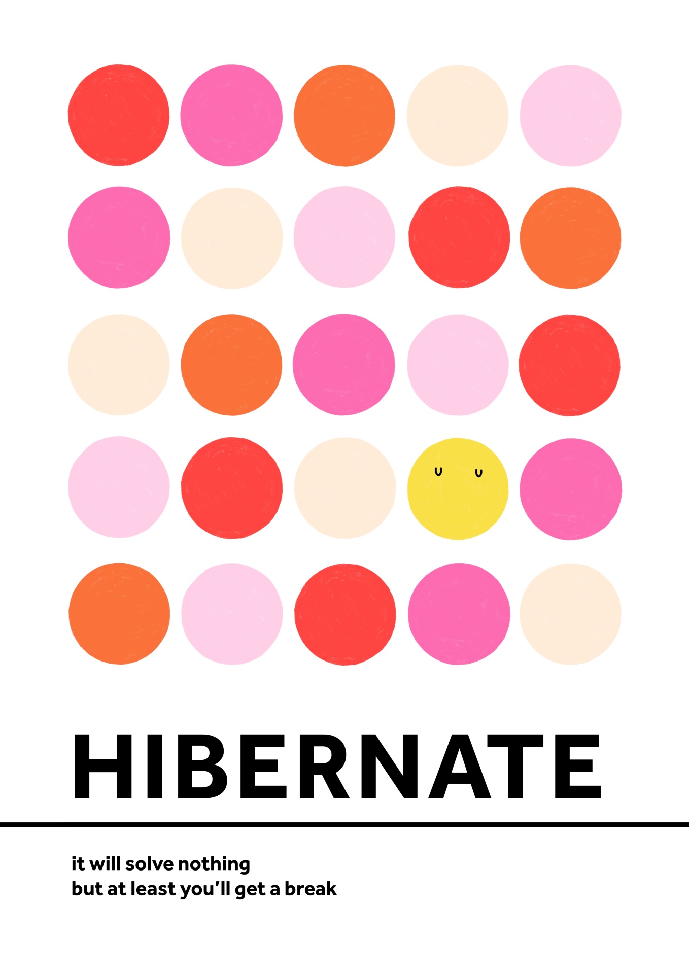 • Póster colorido com círculos e texto HIBERNATE em fundo branco.