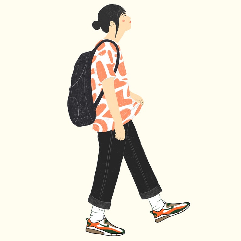 • Ilustração de pessoa com roupa casual e mochila, a andar