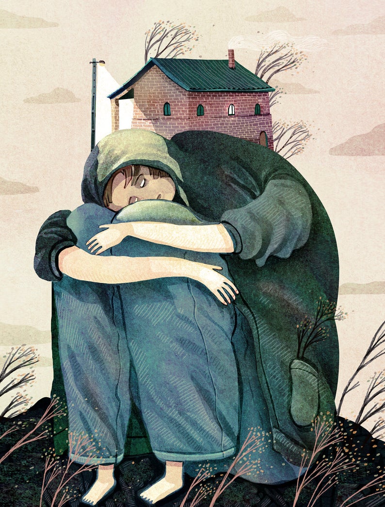 Pessoa ilustrada com casa desenhada nas costas, sentada no chão com braços e pernas visíveis e fundo com plantas secas.