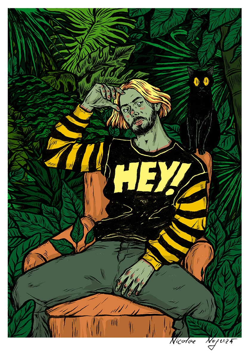 • Homem loiro com camisola preta e amarela 'HEY!' sentado em poltrona laranja com gato preto e folhagem verde ao fundo