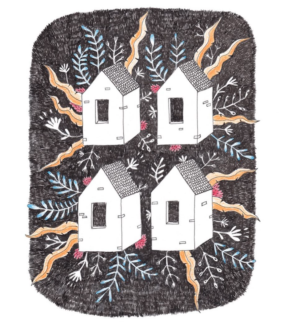 • Desenho de quatro casinhas brancas com elementos decorativos coloridos ao redor