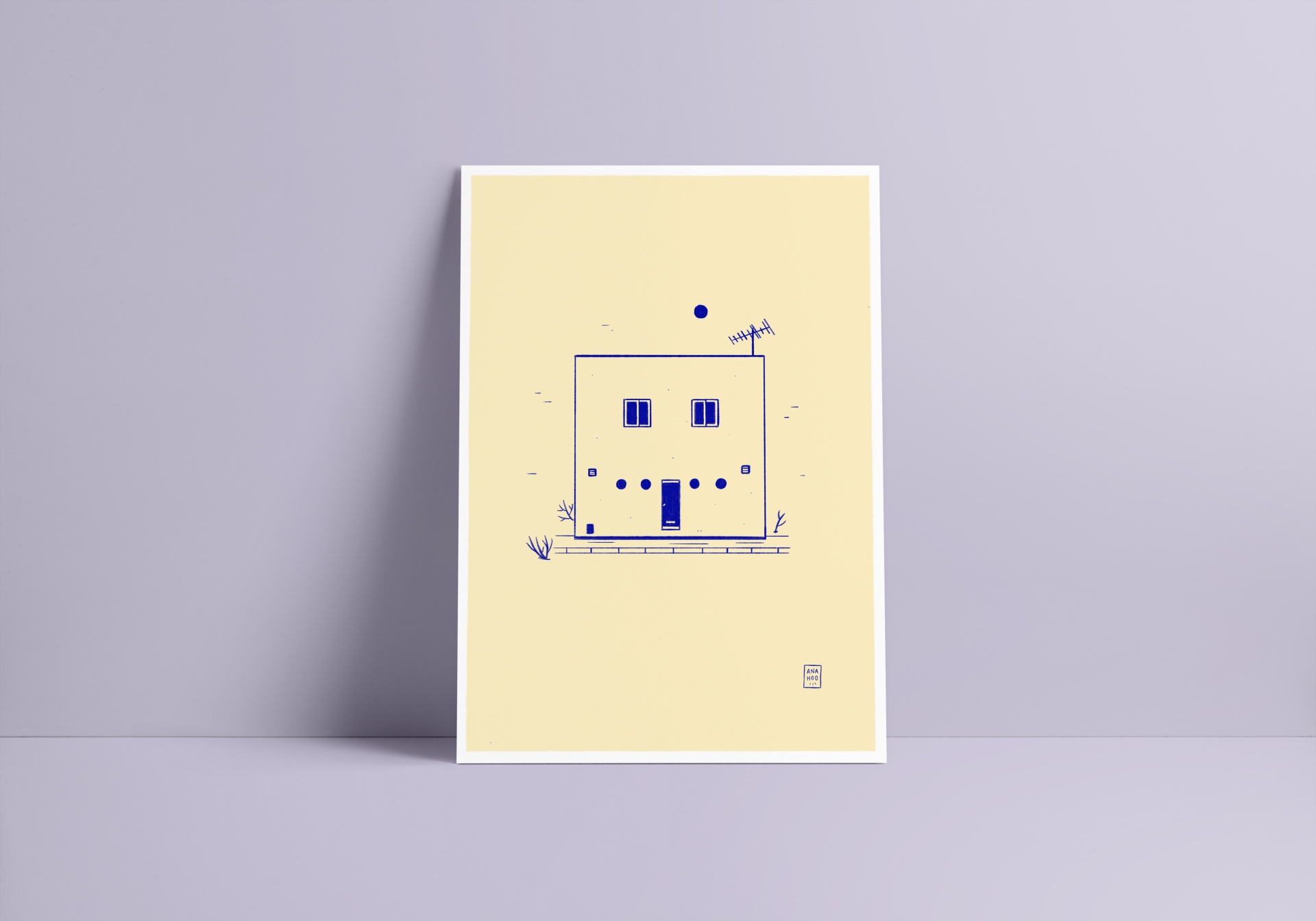• Pôster com ilustração minimalista de casa azul sobre fundo bege