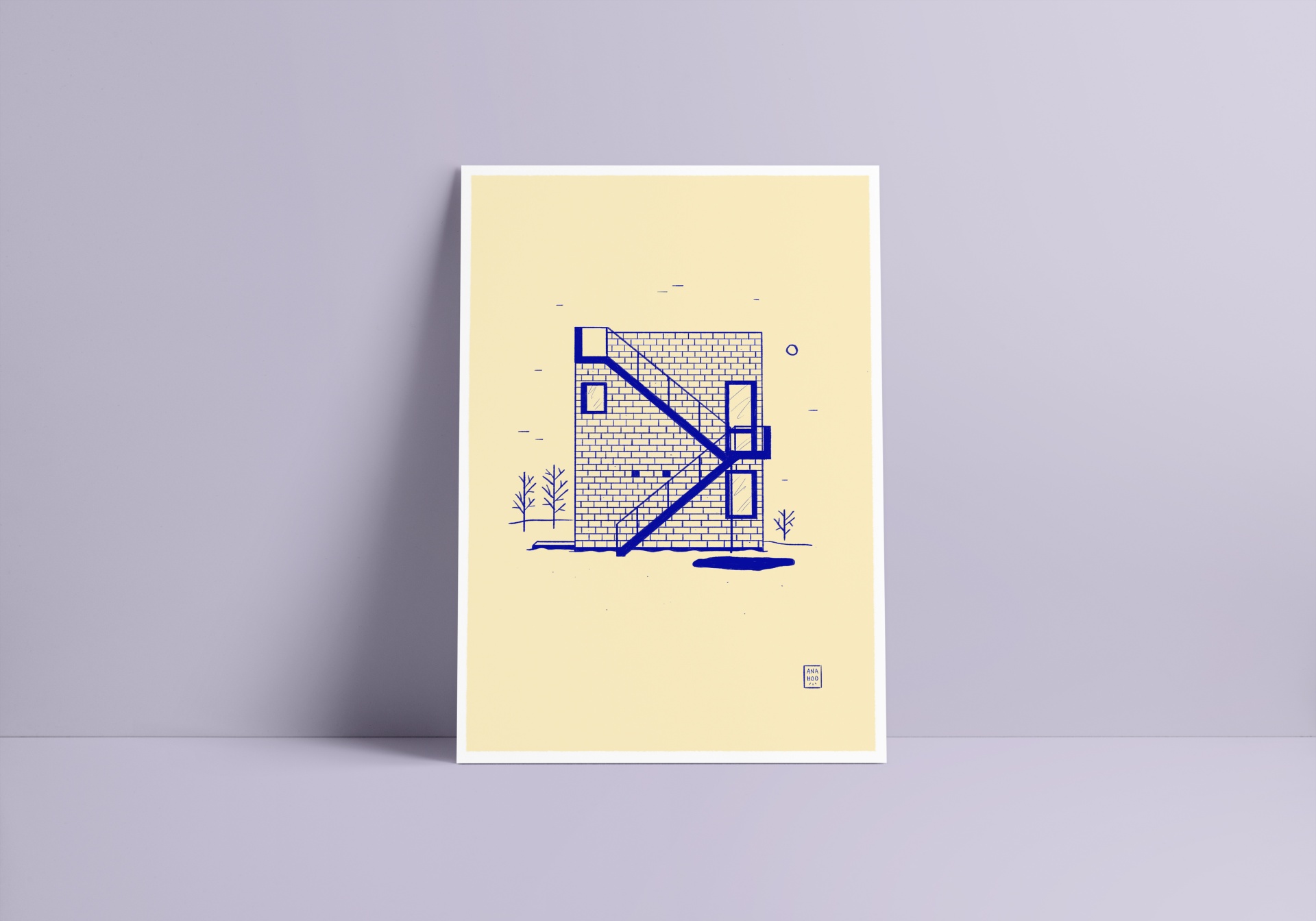• Ilustração minimalista azul em fundo bege com formas geométricas e plantas, apoiada numa superfície junto a uma parede lilás