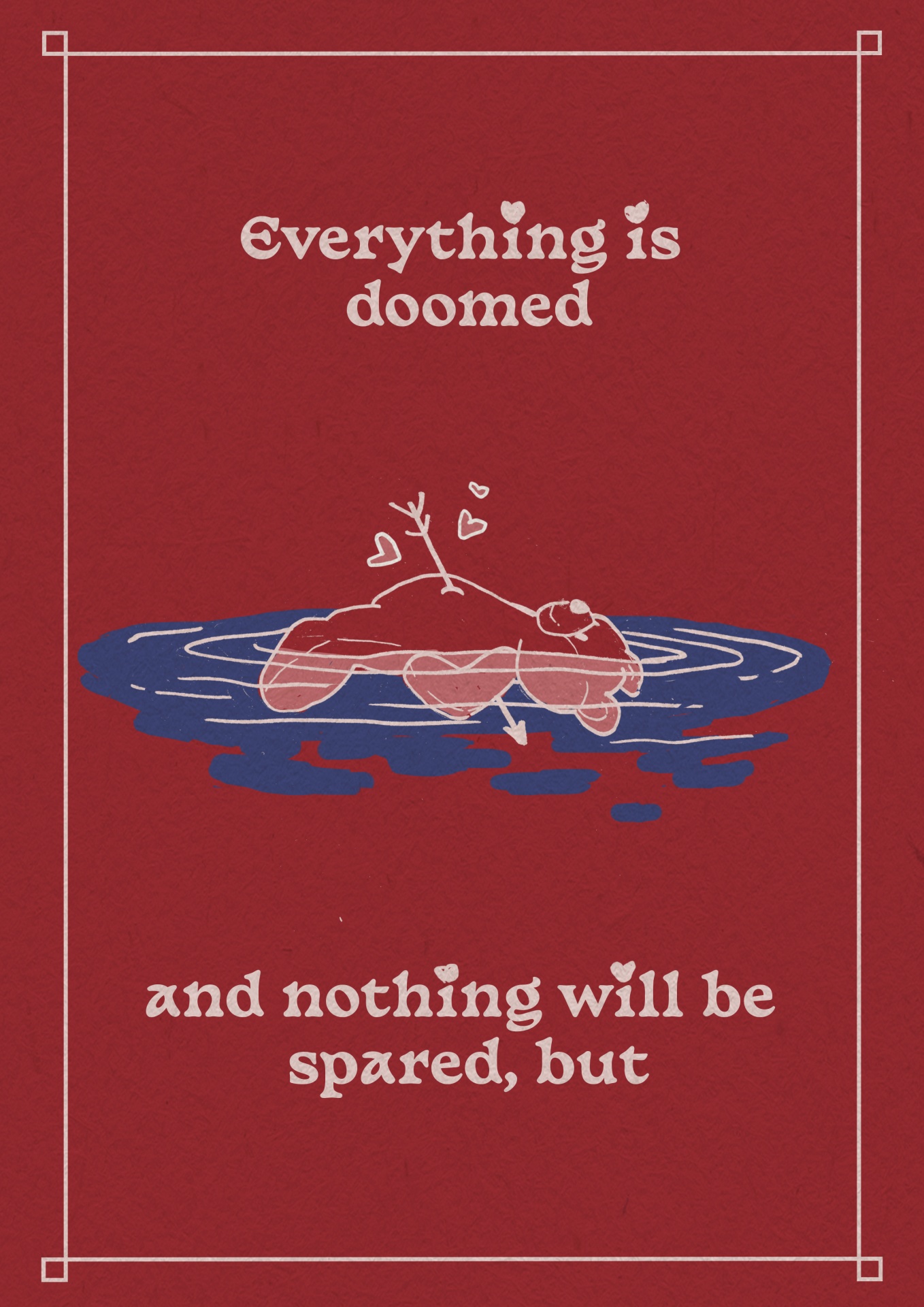 A economia está lamentável, a crise climática pior que nunca, a guerra iminente assola-nos o coração, mas ao menos temos o amor para nos consolar e alguém com quem o partilhar…., e quem não tiver é o salve-se quem puder. I Love You, Honeybear, faz-nos sentir parte de um casal com espírito us against the world, completamente embriagados com o fumo de uma nova paixão, e simultaneamente, parte da humanidade e de todos os problemas que a apoquentam, humanidade esta, que por vezes olha de lado para o verbo Amar. Este desenho é um manifesto ligeiramente irónico ao dia de S.Valentim e à sua cheesiness e ao mesmo tempo a sua celebração, porque no final do dia All You Need is Love.