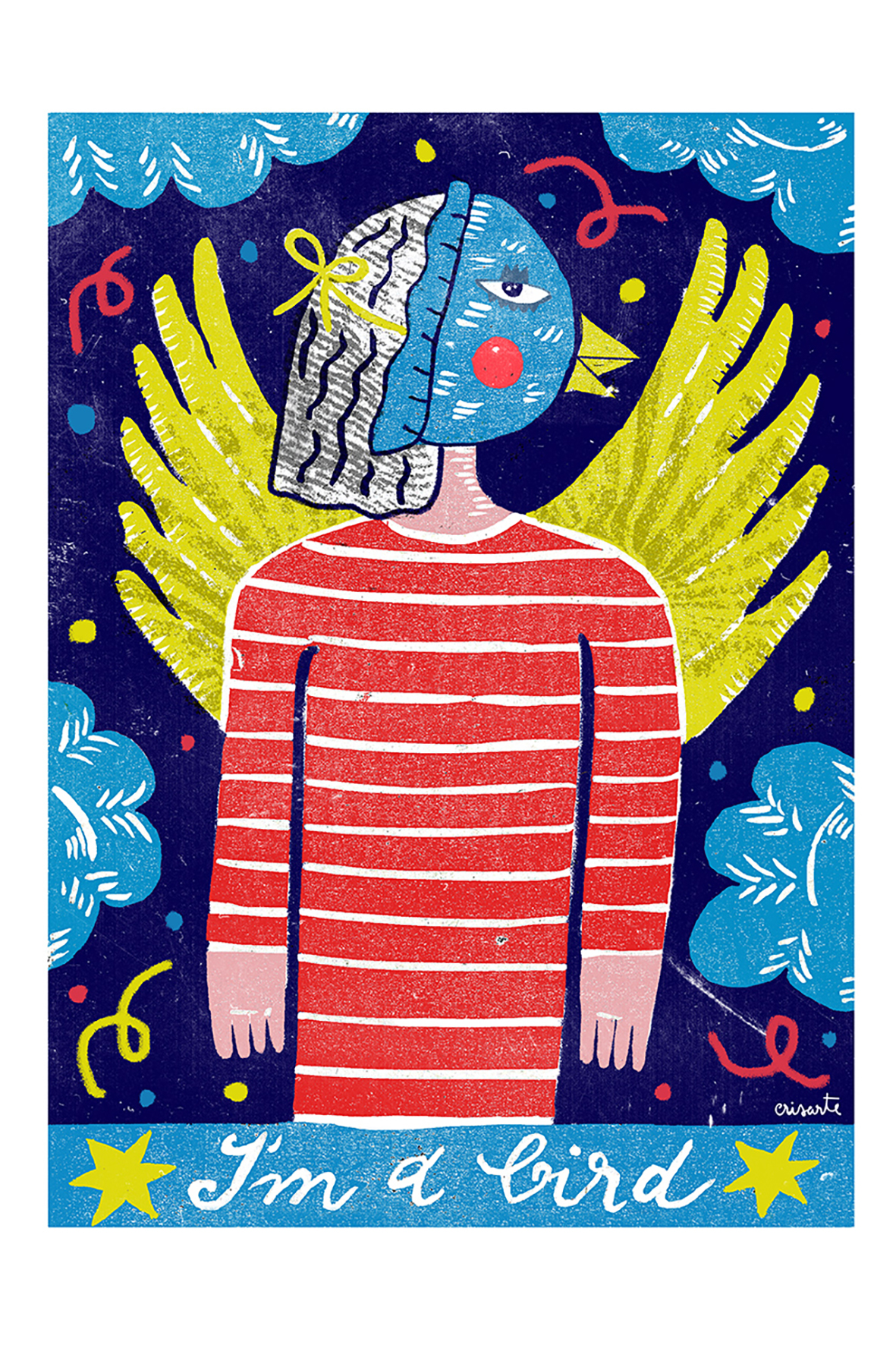 Esta ilustração é o meu auto-retrato. Gostava muito de ser um pássaro e ir para onde me apetecesse ir.