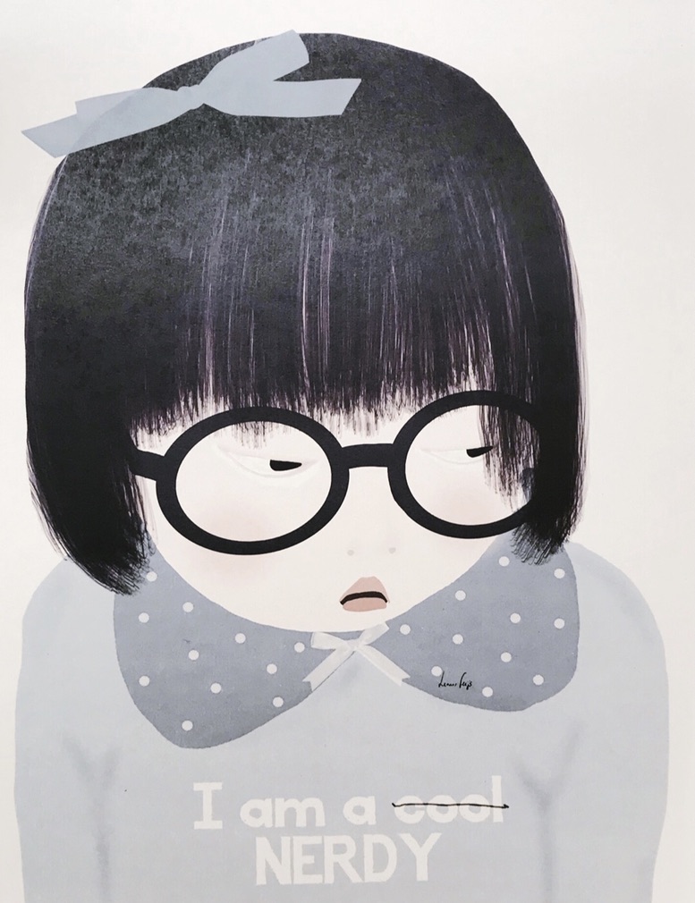 Ilustração de rapariga com óculos redondos e laço cinza no cabelo, camisola com texto 'I am a cool NERDY'