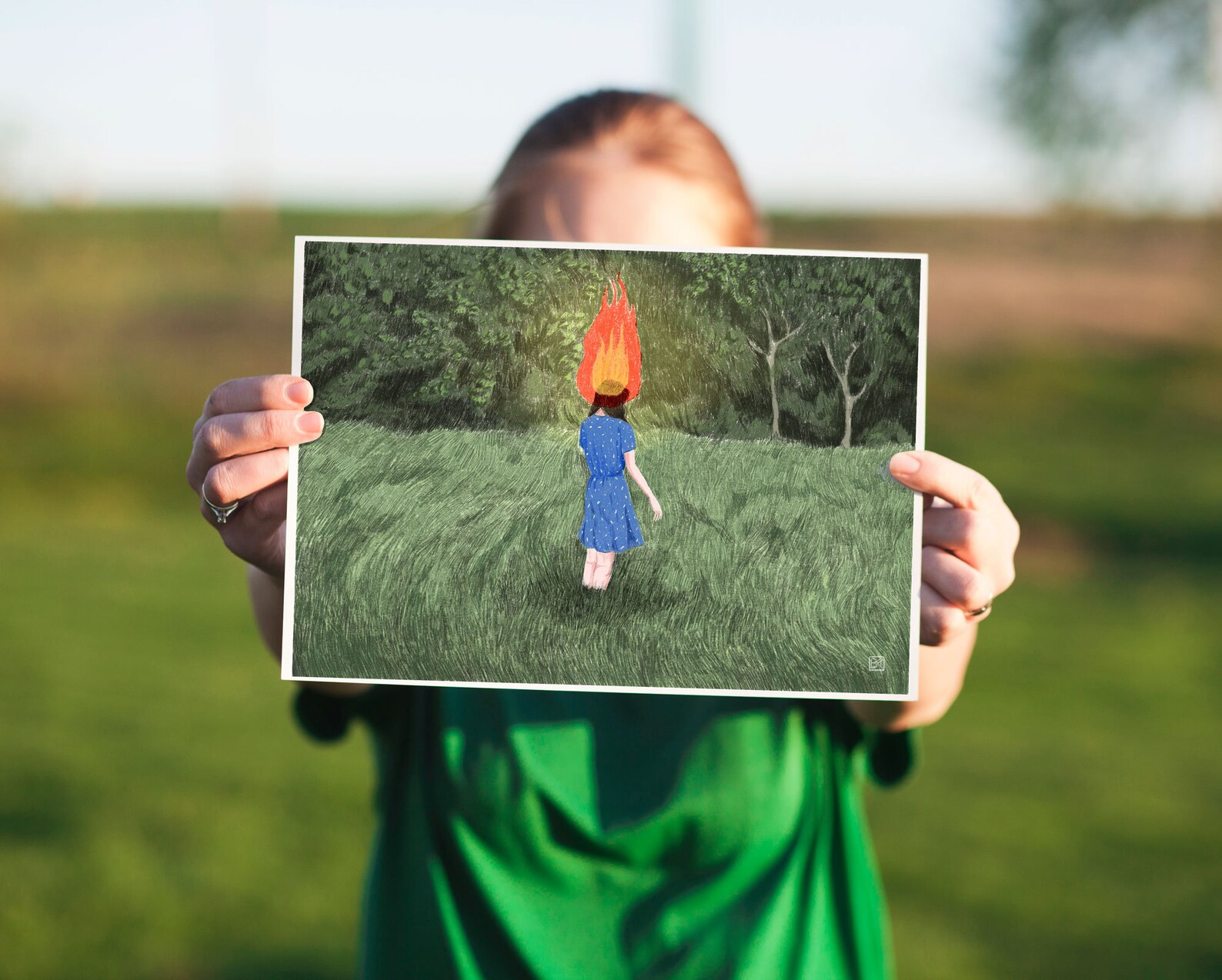 • Pessoa segura fotografia de menina em campo verde com cabeça de fogo
