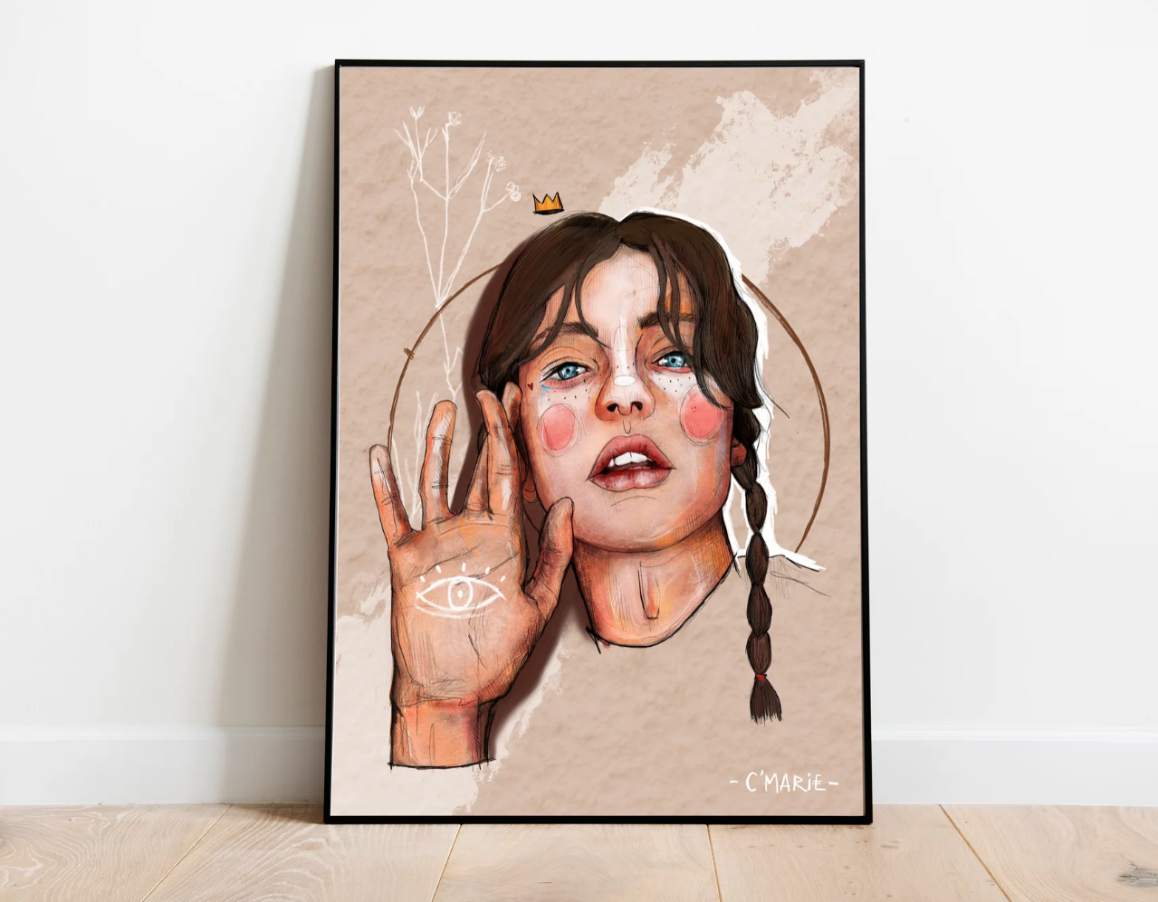 • Pôster artístico de uma mulher com desenhos e moldura preta apoiado em chão de madeira