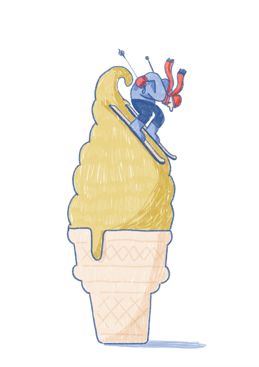 • Ilustração de um gelado de casquinha com esquiador em cima