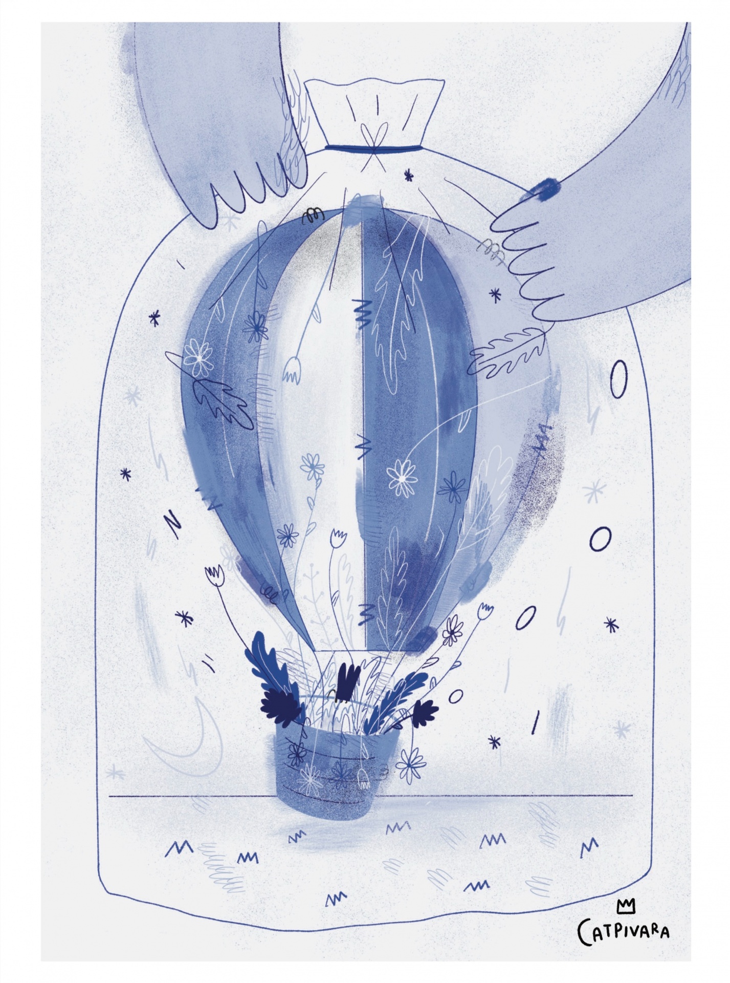 • Desenho azul de balão de ar quente com flores dentro de saco transparente