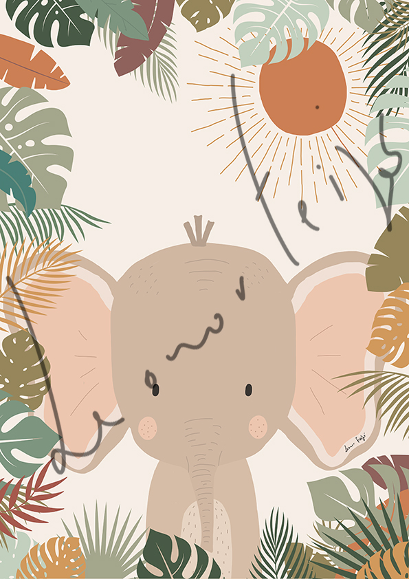 • Desenho de elefante com folhas tropicais e sol laranja.