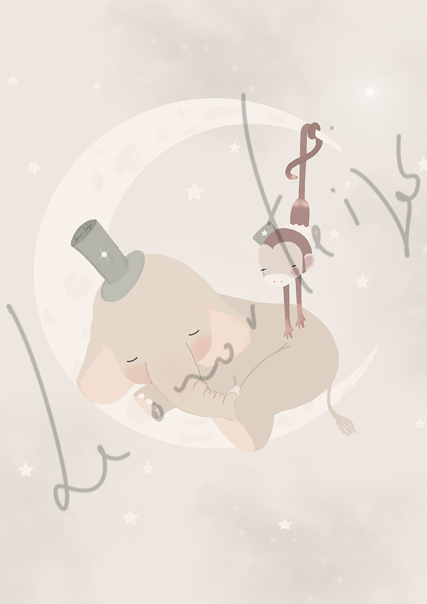 • Ilustração de elefante e macaco com chapéu sobre uma lua com estrelas num fundo bege