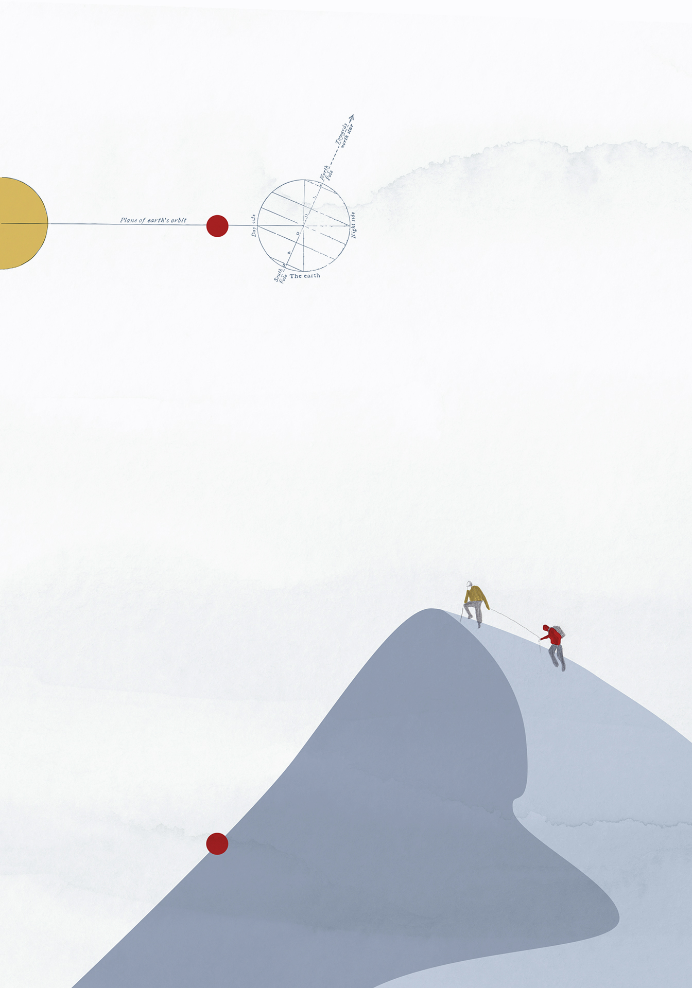 • Ilustração de montanha azul com duas pessoas a escalar e diagrama astronómico no canto superior esquerdo.