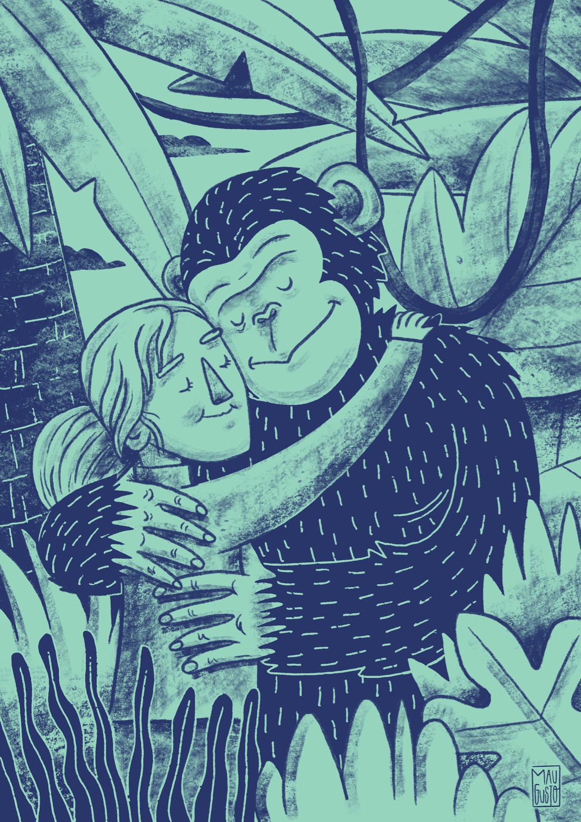 Para mim a escolha foi imediata, quis ilustrar a Jane Goodall por ser uma de muitas mulheres extraordinárias que já pisou este planeta e por deixar um legado. Sobre o trabalho é completamente digital, usando apenas duas cores que apelassem à selva e usei um traço de lápis e outro de crayon pois é um estilo que estou a gostar muito de explorar. A composição também foi de rápida execução pois a ideia ficou clara na minha mente. Ela teria de ser representada de forma a estar completamente envolvida na selva, no abraço à sua causa de vida e trabalho e que transmitisse a quem vê uma certa serenidade e felicidade.