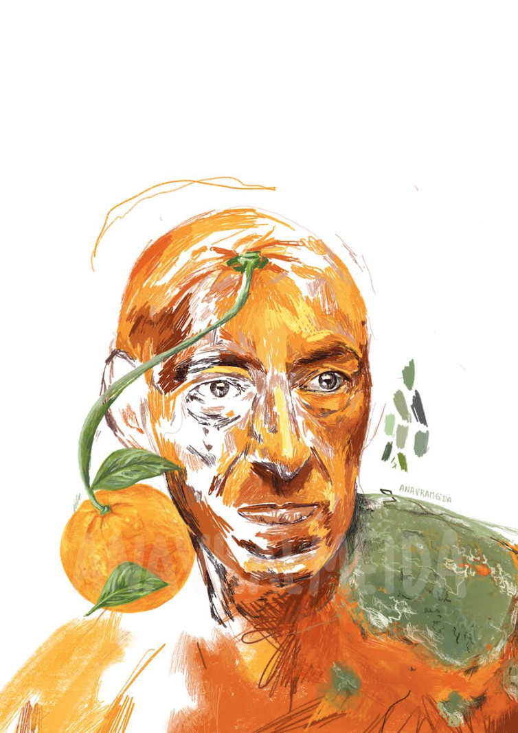 Ilustração artística de homem com tangerina e tons laranja e verde.