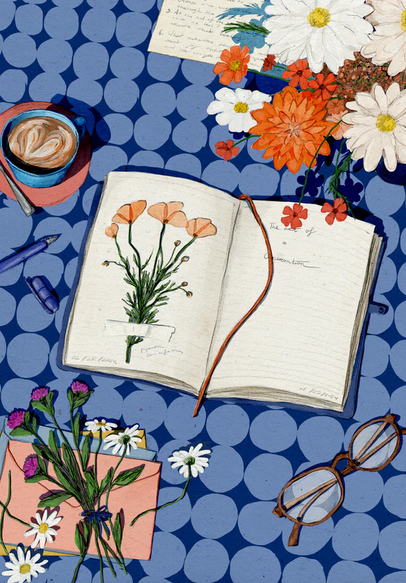 • Mesa azul com livro aberto, flores, óculos, caneta e chávena de café