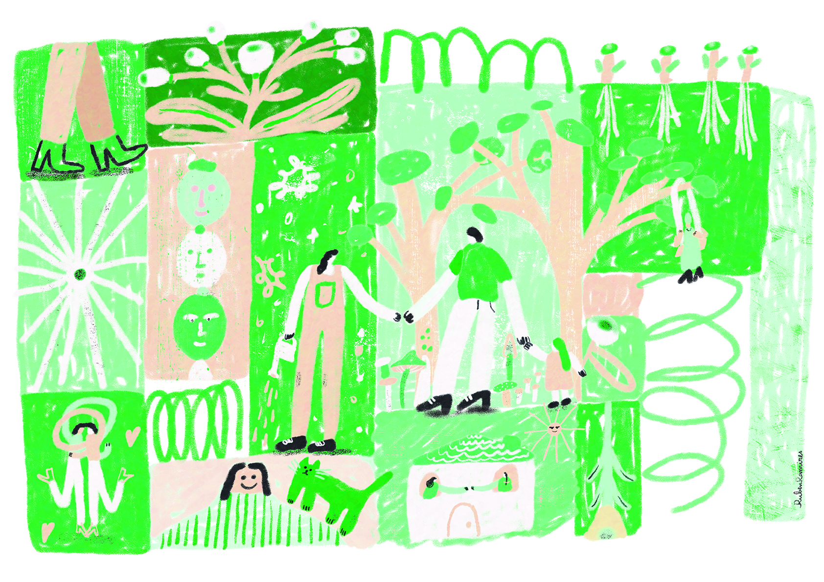 Ilustração colorida de figuras humanas, plantas, árvores e animais em blocos geométricos verde e bege.