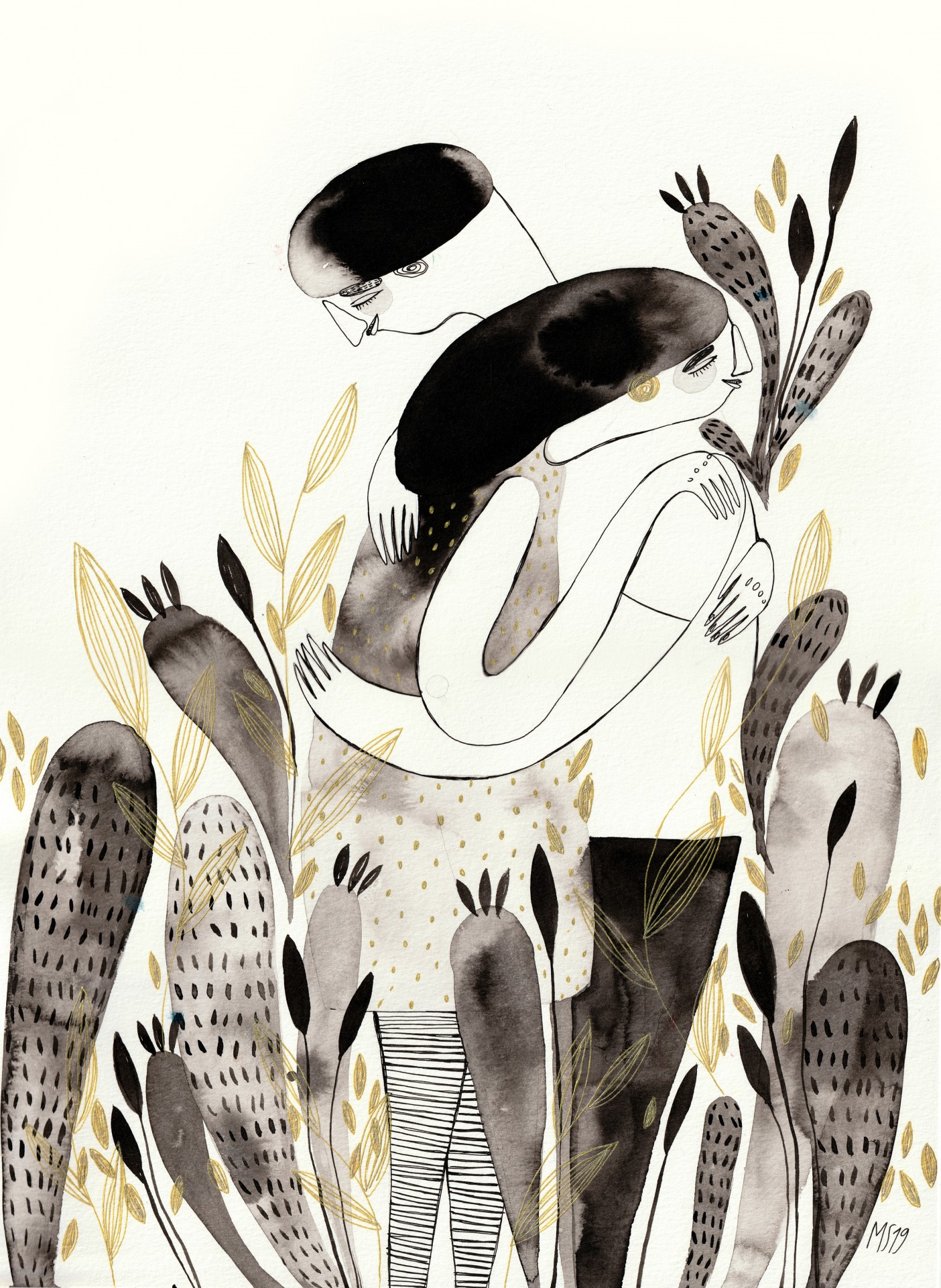 Ilustração a preto, cinza e dourado de duas pessoas abraçadas rodeadas por plantas estilizadas