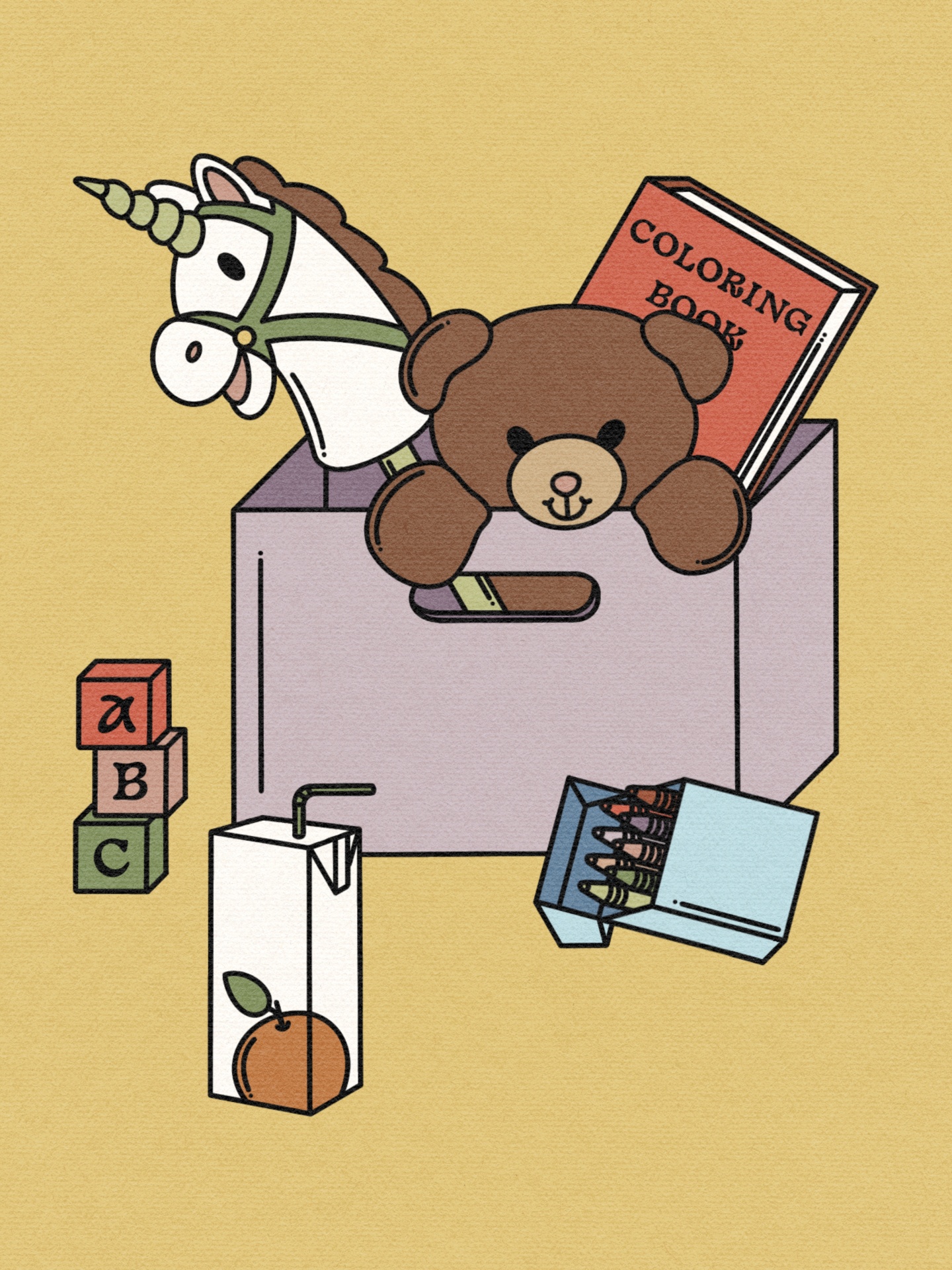 • Caixa cor-de-rosa com brinquedos e material escolar sobre fundo amarelo.