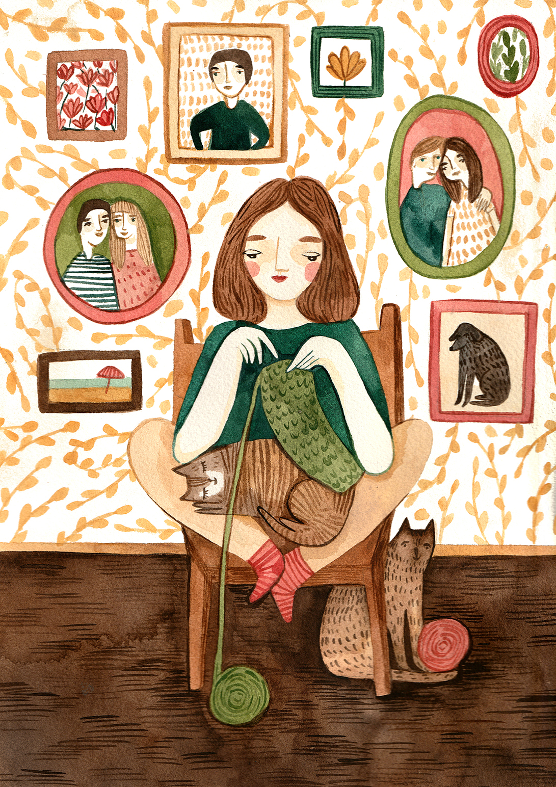 • Mulher a tricotar com gatos ao redor, parede decorada com quadros e padrão de folhas.