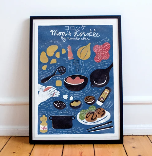 • Pôster com receita ilustrada 'Mom's Korokke' com desenhos coloridos de ingredientes e utensílios, em moldura preta sobre chão de madeira