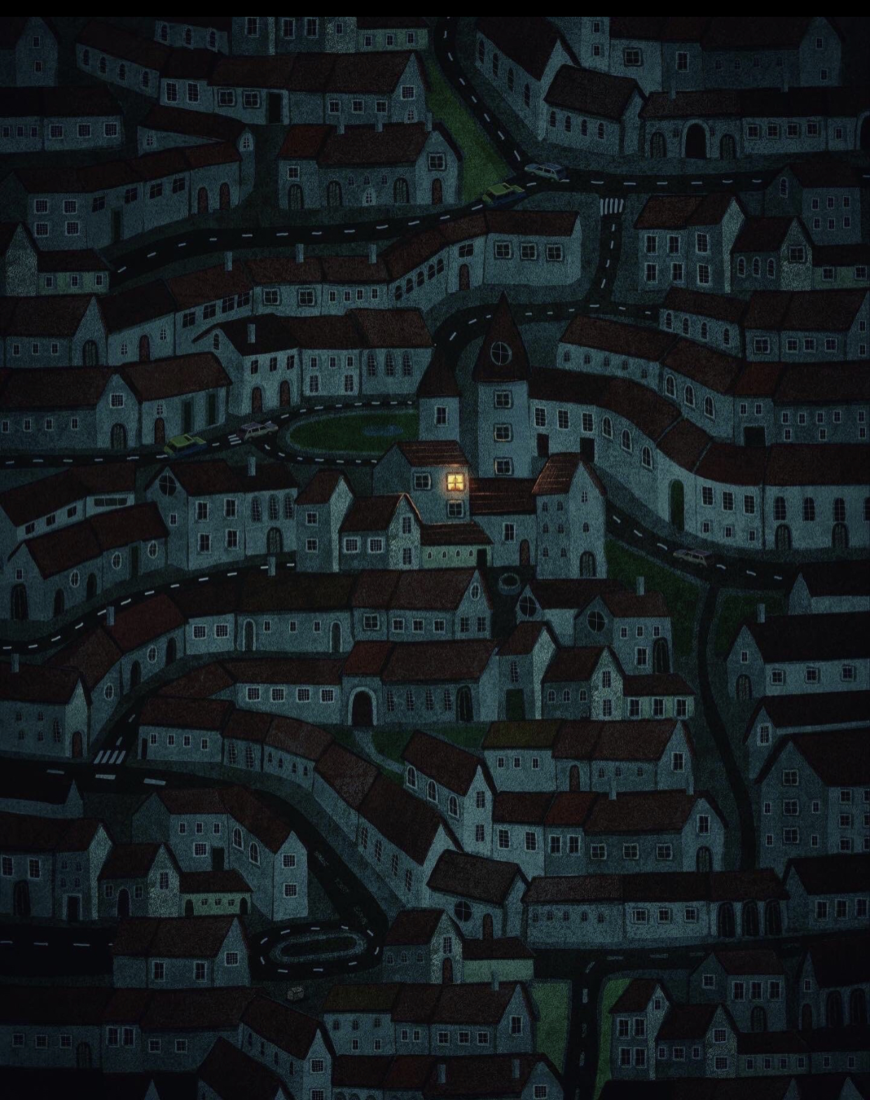 • Ilustração noturna de cidade com casas brancas e janelas, uma janela iluminada