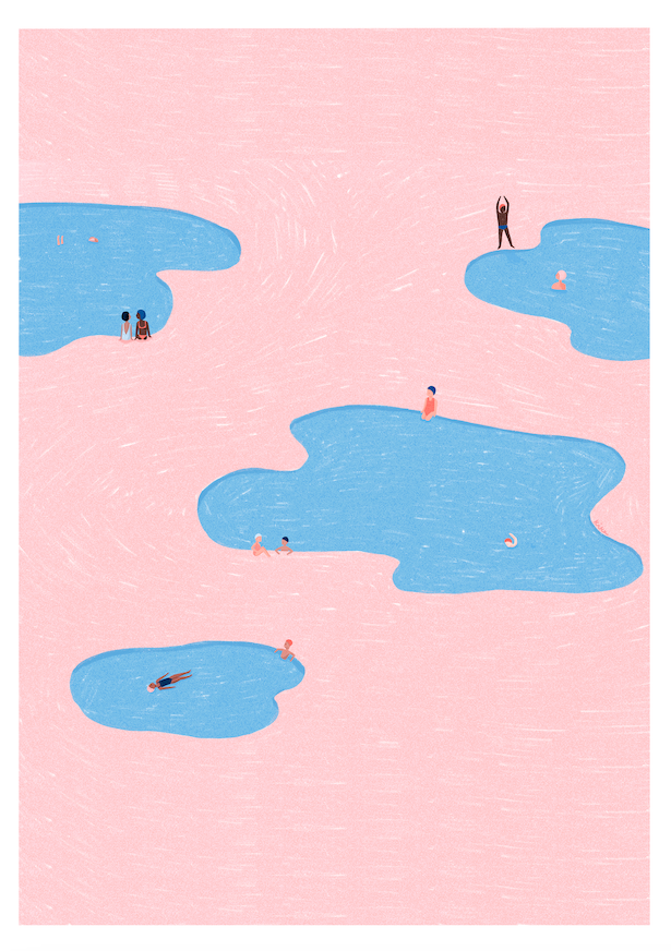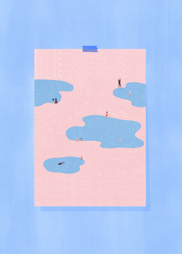 • Cartaz com pequenas figuras humanas junto a poças de água azuis sobre fundo rosa
