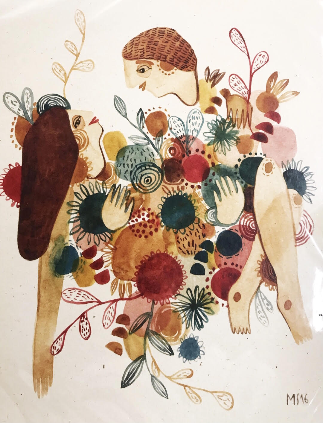 Ilustração artística de duas figuras humanas com padrões florais e folhas coloridas
