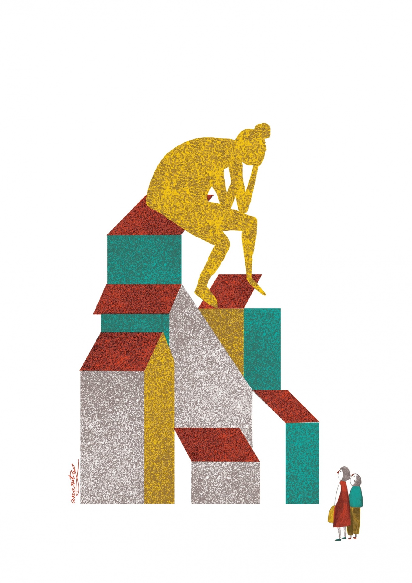 Ilustração de figura amarela sentada sobre formas geométricas coloridas e duas pessoas pequenas a observar.
