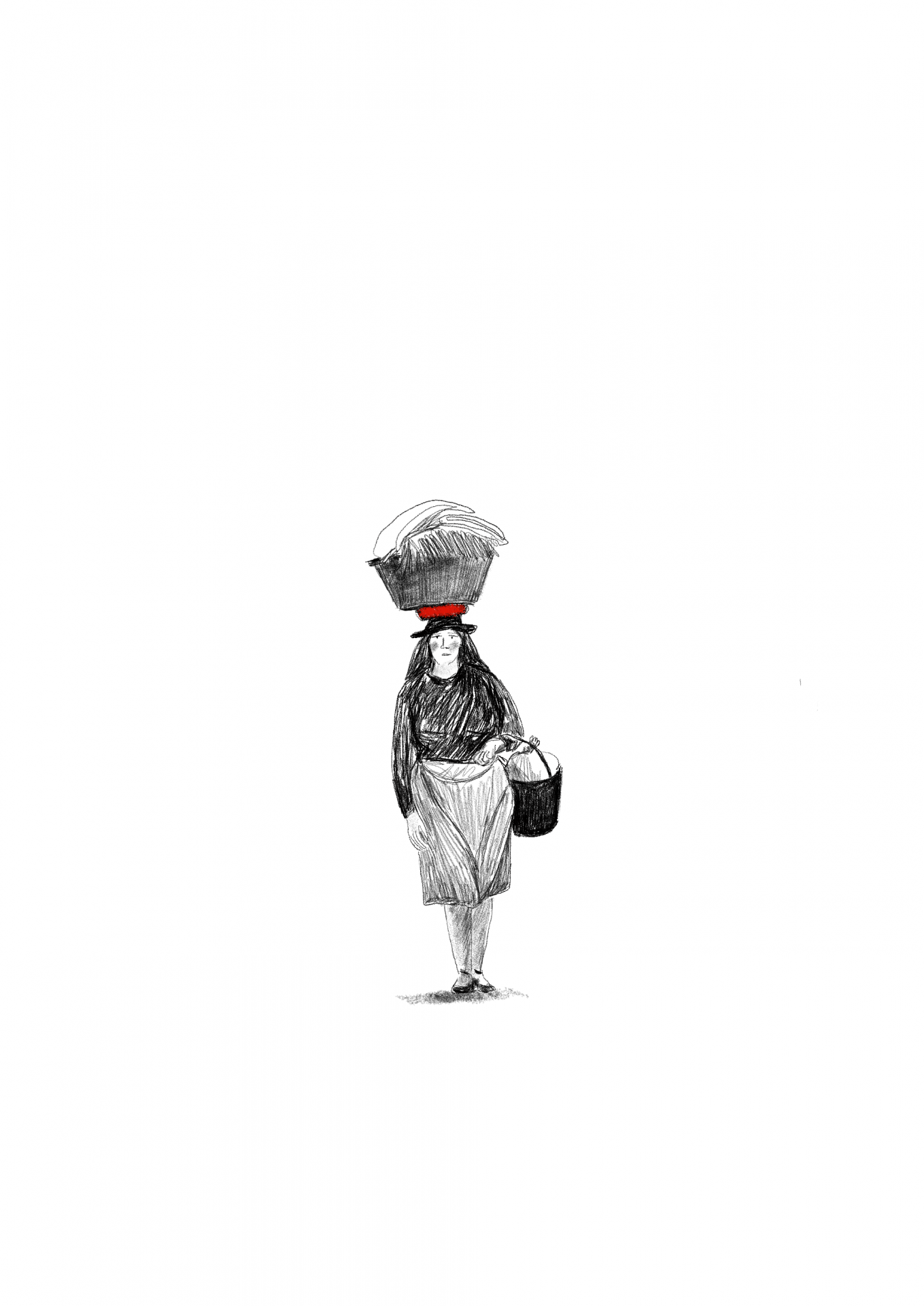 • Desenho de mulher com cesta na cabeça e balde na mão