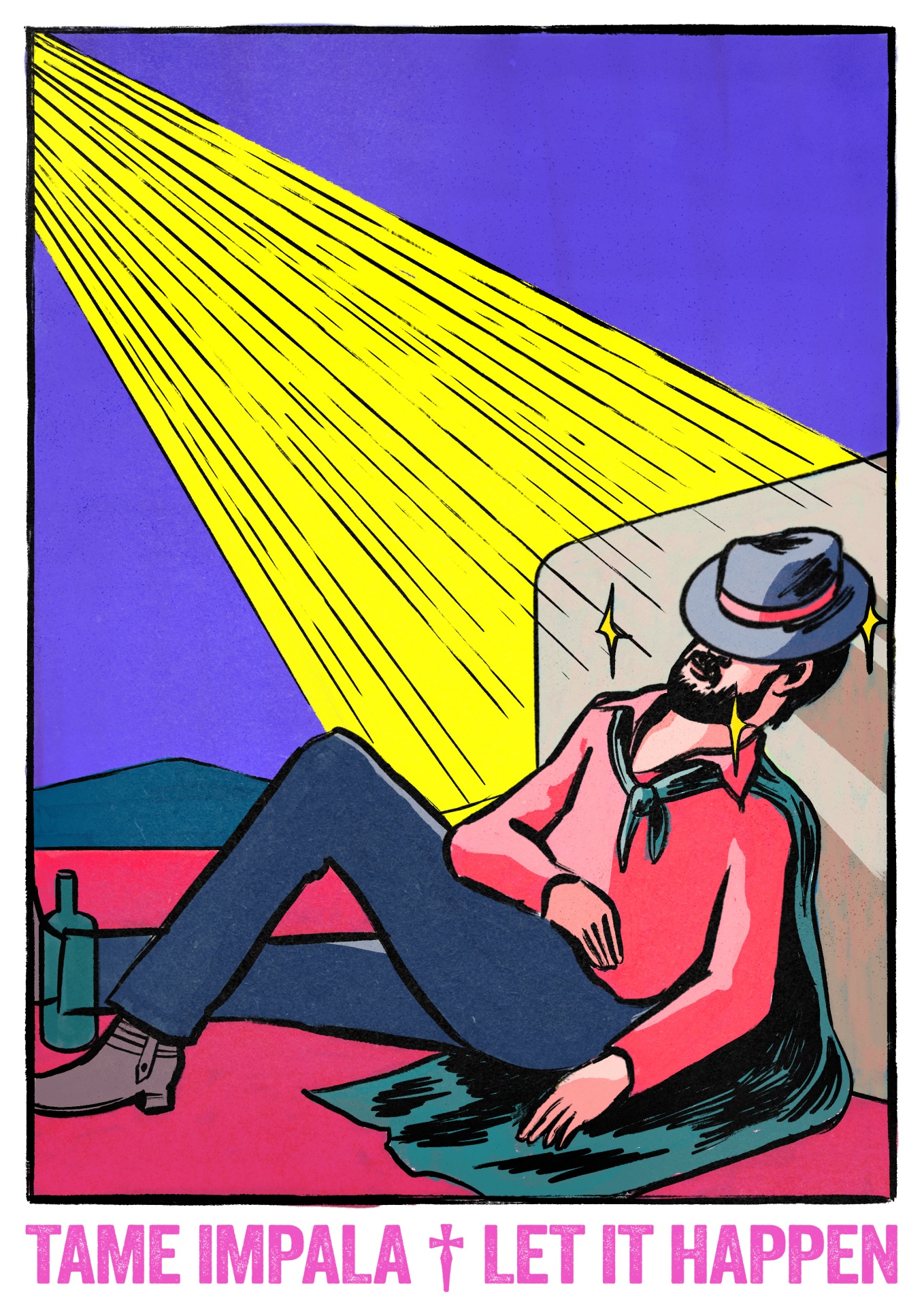 Ilustração colorida de figura humana com chapéu recostada contra superfície cinza com luz amarela e texto TAME IMPALA LET IT HAPPEN