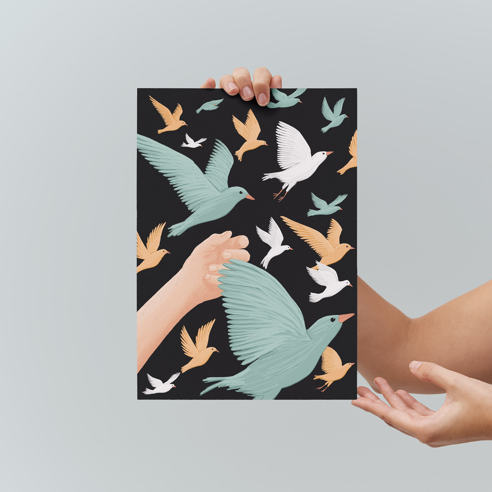 • Padrão de pássaros coloridos em cartaz preto, segurado por duas mãos