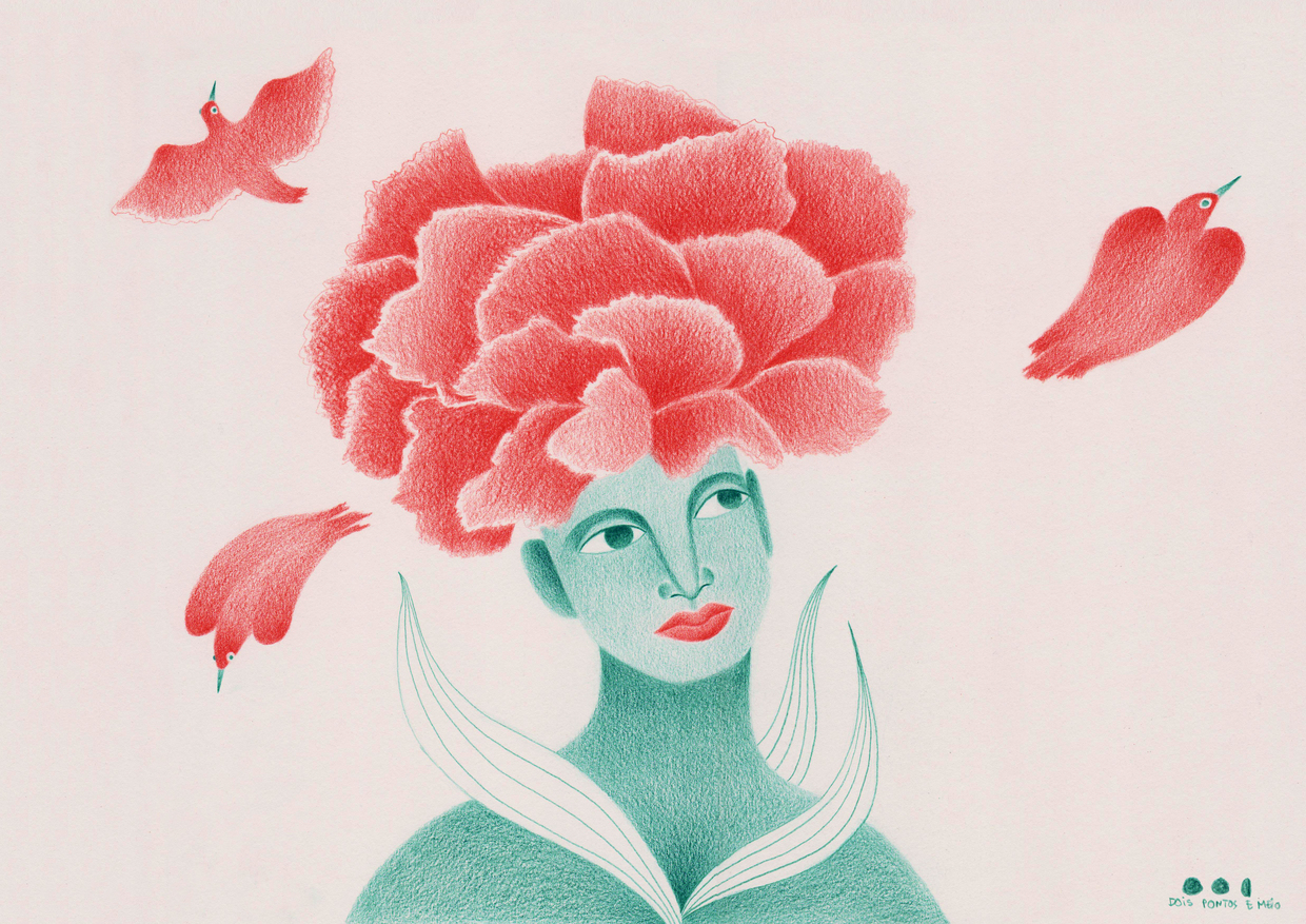 Figura humana com flor rosa na cabeça e pássaros vermelhos em fundo branco