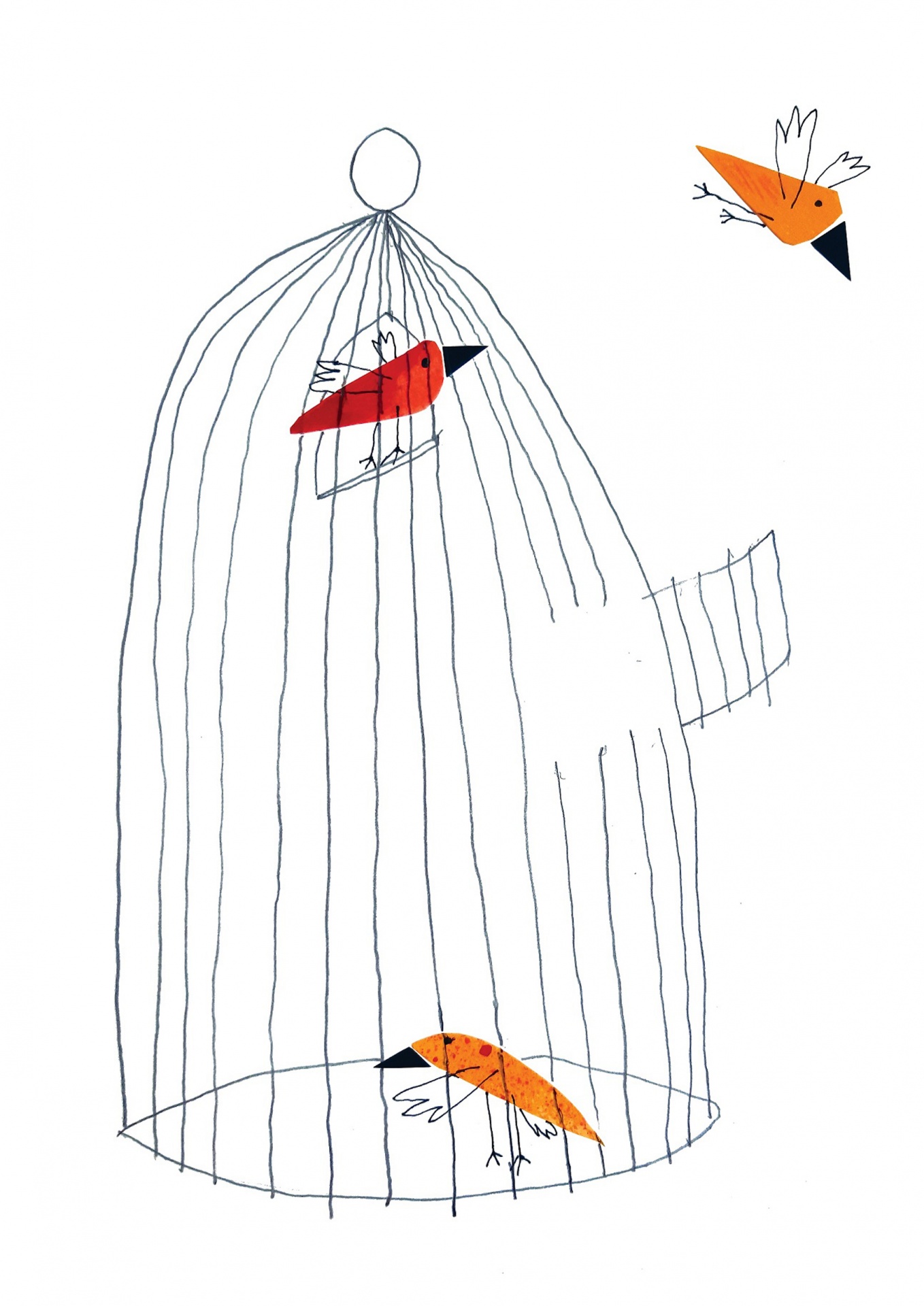 Desenho minimalista de gaiola com um pássaro vermelho dentro e dois pássaros laranja fora dela.