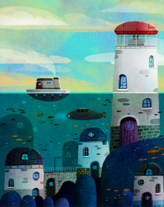 • Ilustração colorida de farol, casas submersas, barco e peixe no mar com céu azul.