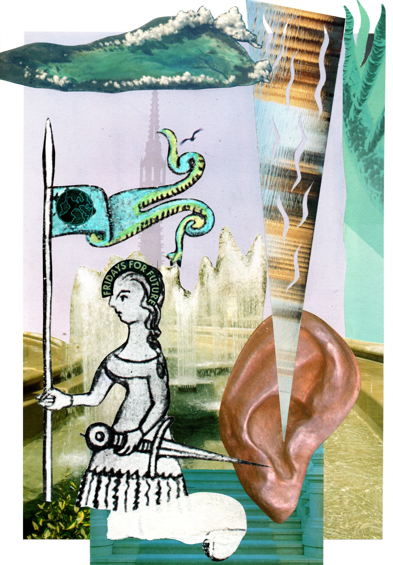 Colagem artística com desenho de mulher medieval, bandeira azul, texto Fridays For Future, nuvem verde, orelha castanha e fundo natural