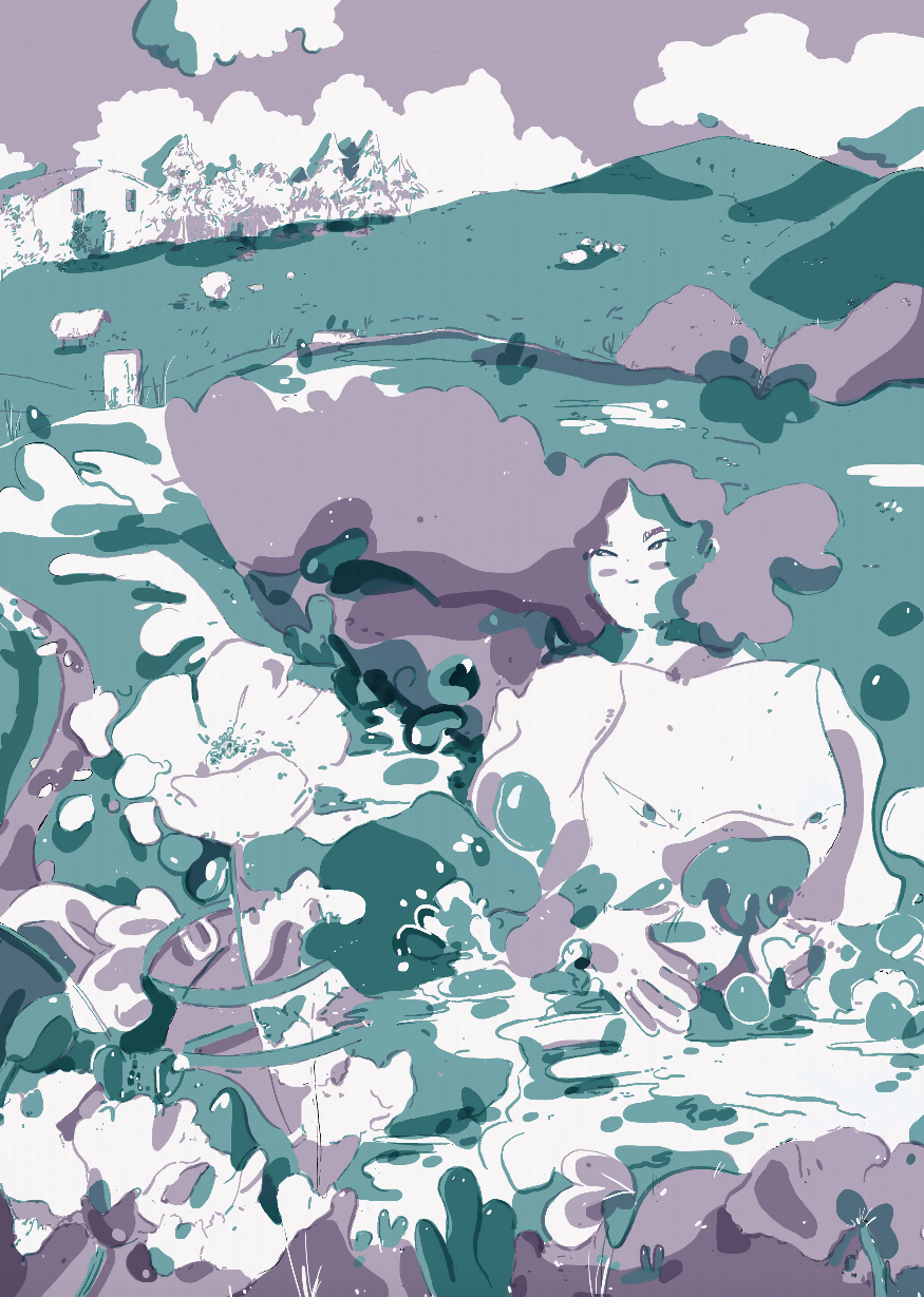 • Ilustração digital com tons verdes e roxos mostrando figura feminina estilizada rodeada por plantas e montanhas
