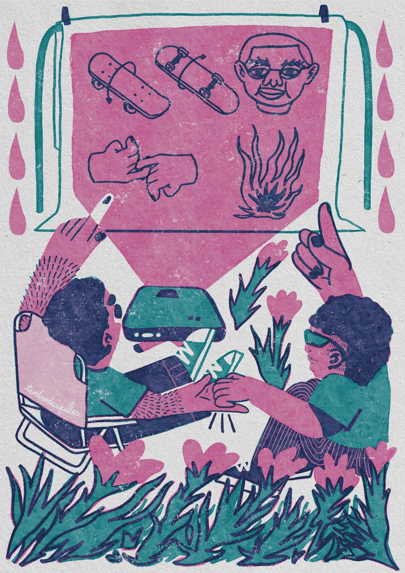 • Ilustração de duas crianças em ambiente com relva e projeção de desenhos num ecrã