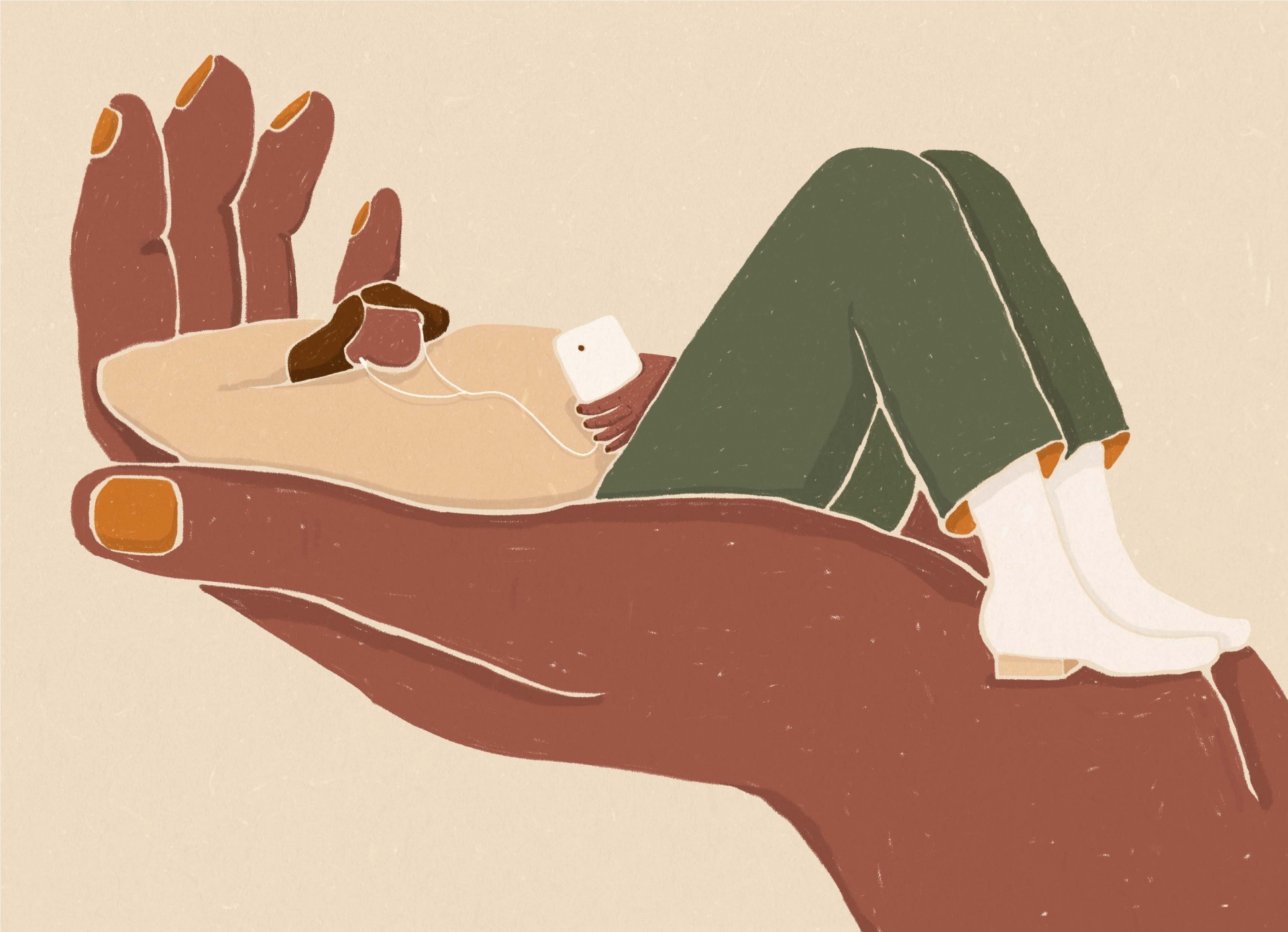 • Ilustração de uma mão gigante a segurar uma pessoa reclinada com roupa casual e auscultadores.