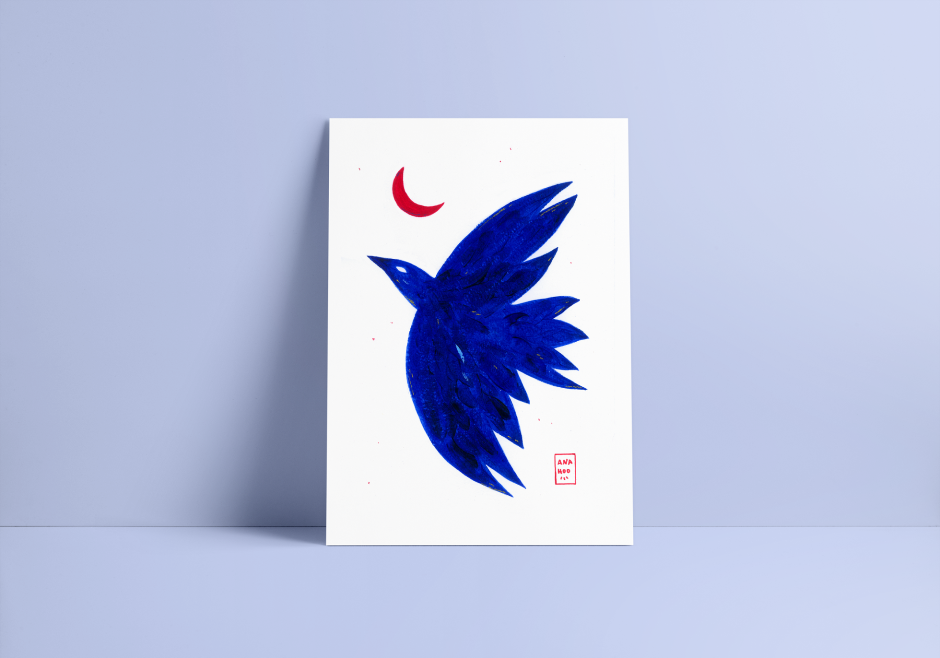 Ilustração de pássaro azul estilizado com crescente vermelho, colocado contra parede azul clara