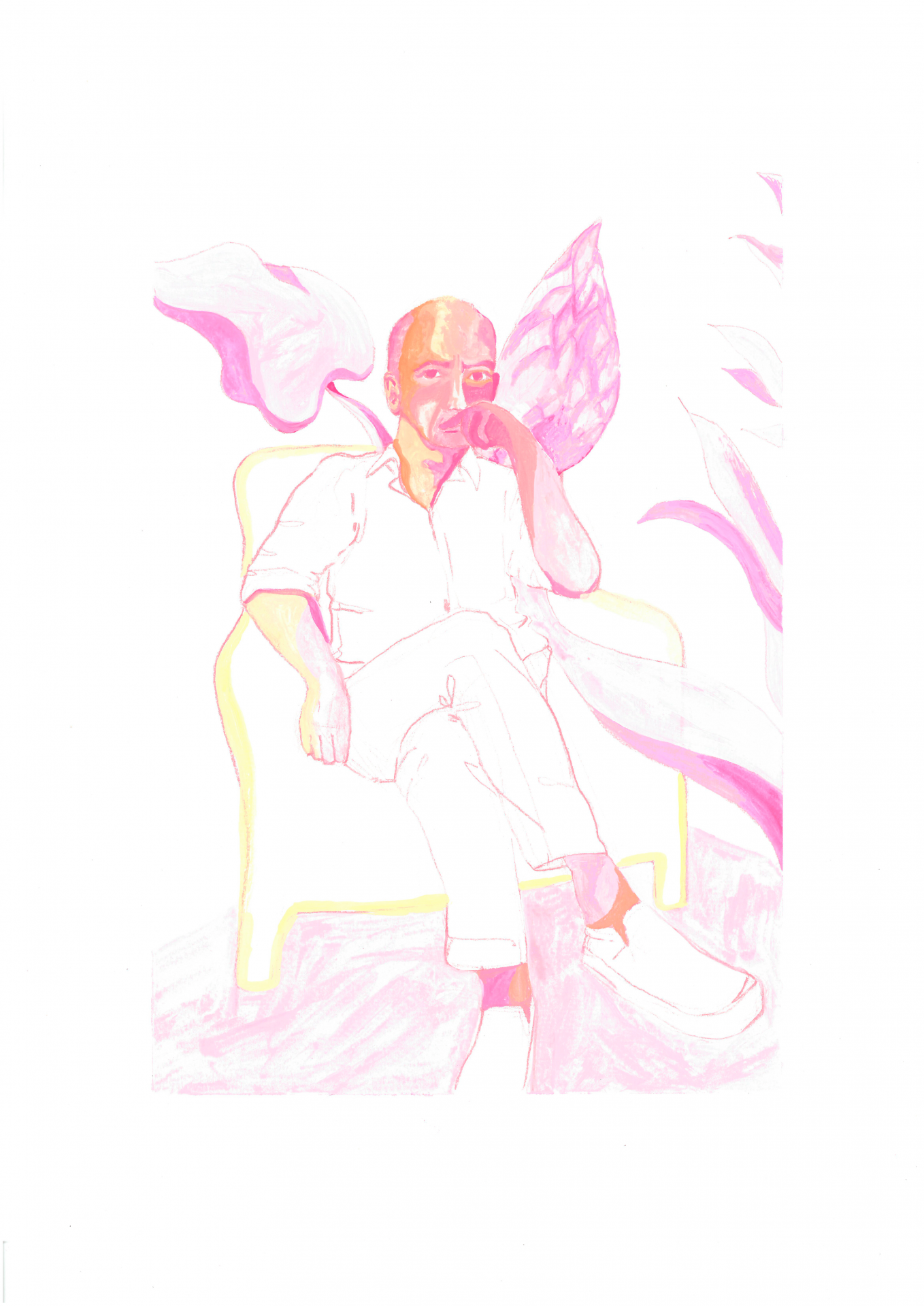 Desenho de homem sentado em poltrona com folhas cor-de-rosa ao fundo