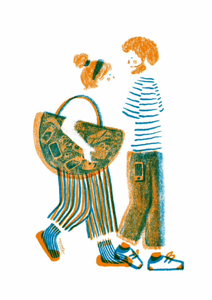 • Ilustração de casal com roupa listrada e bolsa castanha