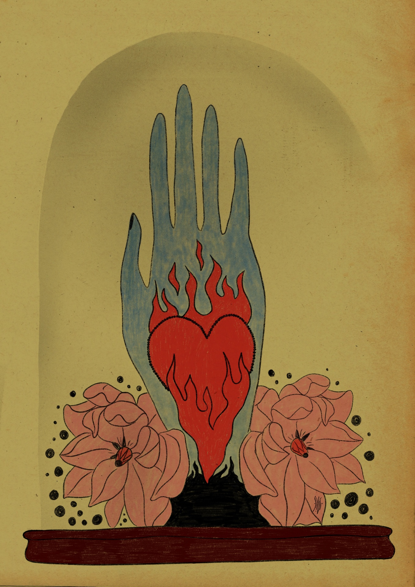 • Desenho de mão azul com coração em chamas vermelho e flores rosa em fundo bege.