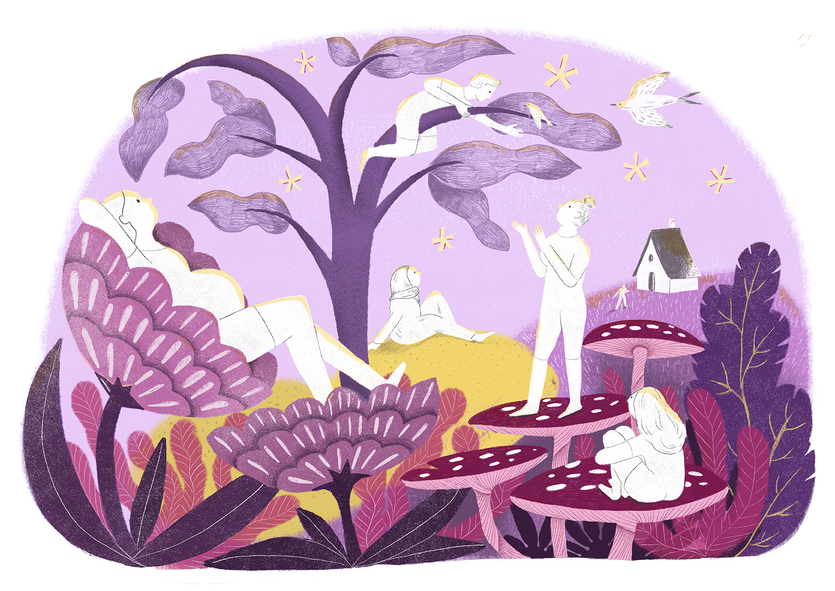 Ilustração de pessoas interagindo com cogumelos grandes em tons roxo e amarelo