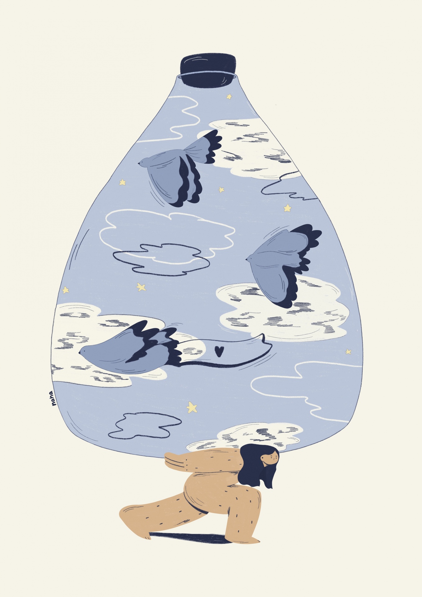 Ilustração de uma garrafa transparente com aves e estrelas, homem baixo em casaco bege em fundo claro