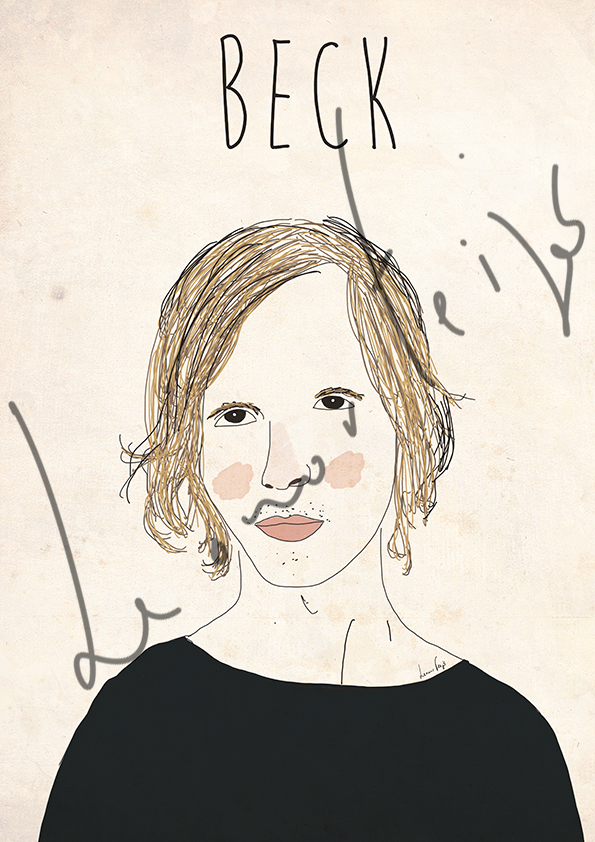 Ilustração de retrato de pessoa com cabelo castanho claro e camisola preta sobre fundo bege com texto BECK