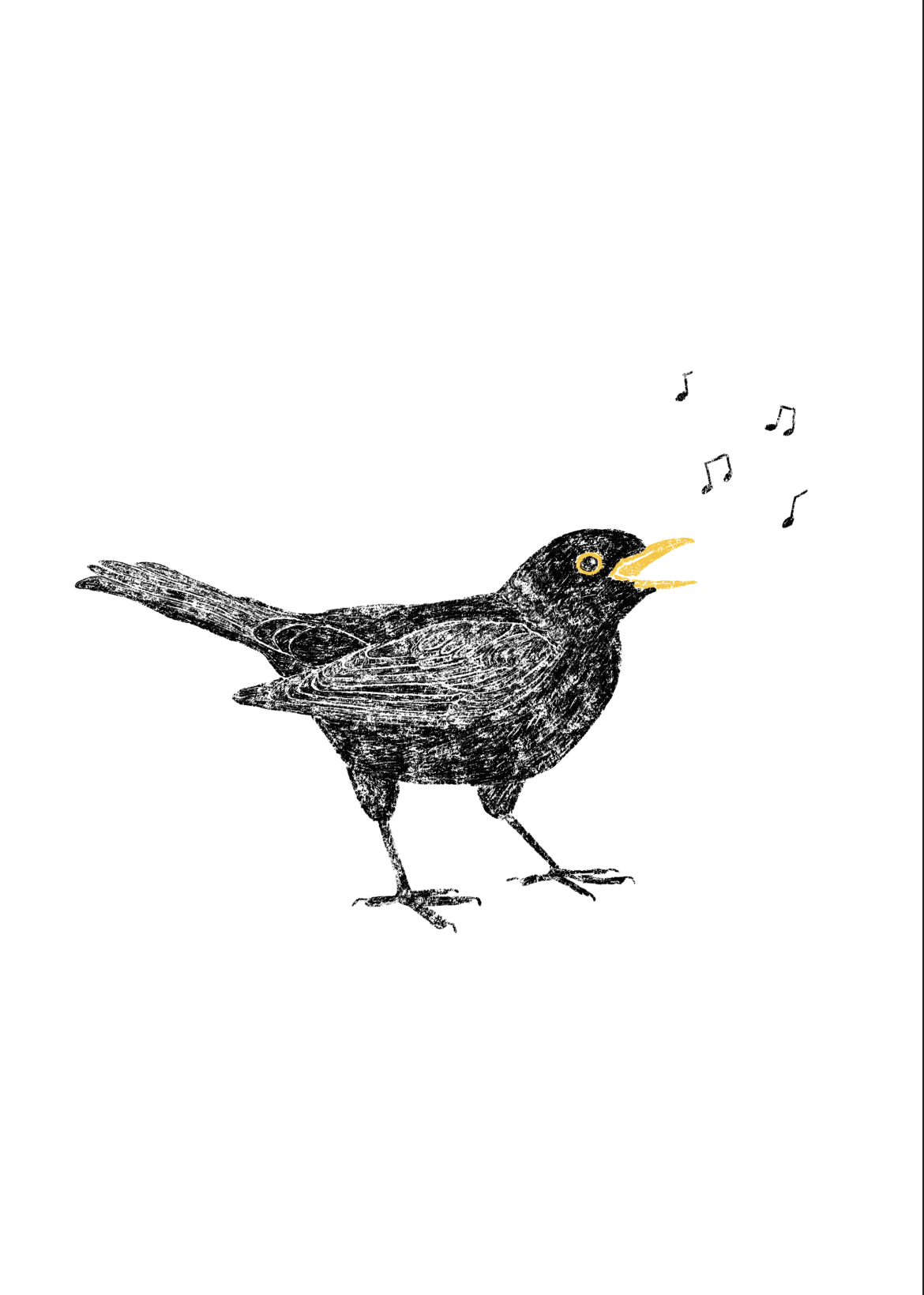 • Desenho de pássaro preto a cantar com notas musicais num fundo branco
