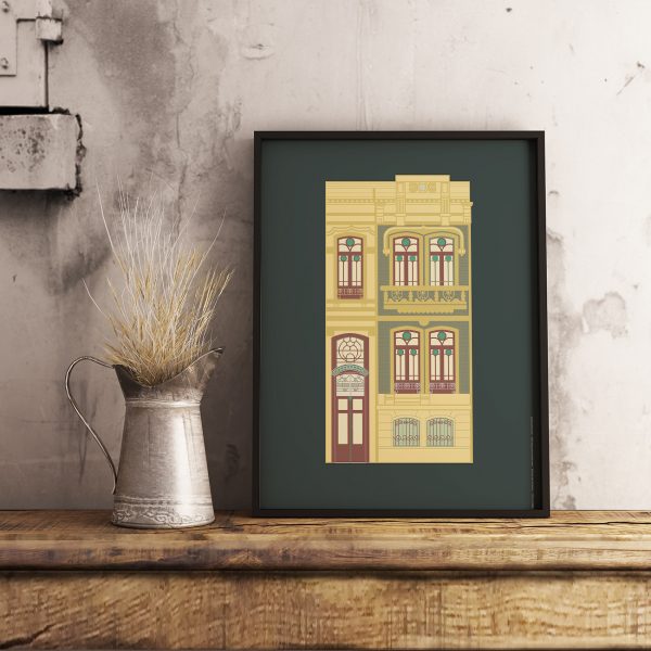 Ilustração figurativa de uma fachada de uma casa na Avenida Brasil, na foz do Douro no Porto.