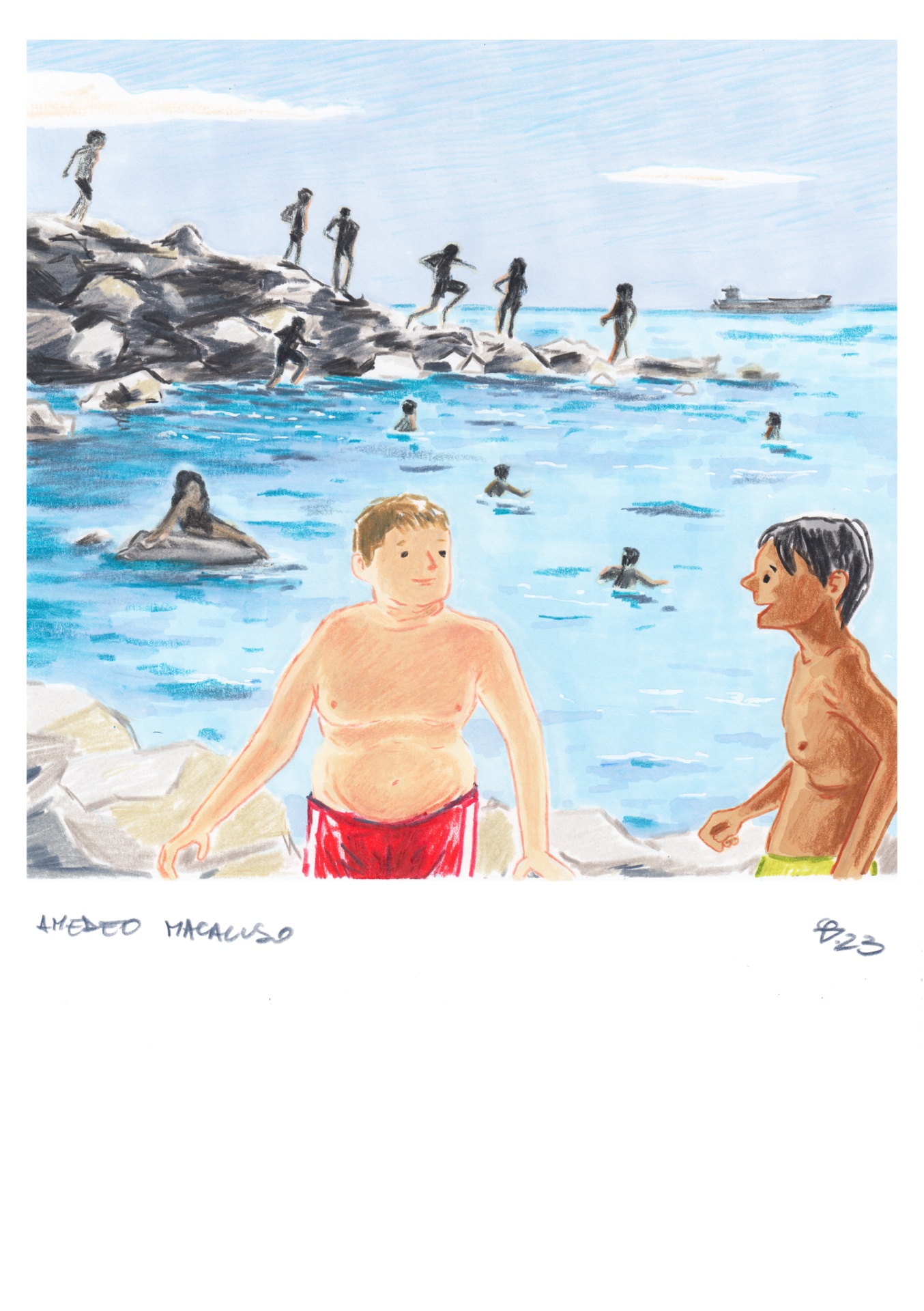 No primeiro plano desta “polaroid” estão representados dois meninos que conversam enquanto outros, à distância, mergulham-se e tomam um banho. A cena apresentou-me-se durante um dia passado na praia, no curso de uma viagem na costa da Toscana. Naquele dia, à beira-mar, vi alguns rapazes nas rochas passarem o tempo felizes. Eu queria salvar a memória fixando no “filme” aquele momento de despreocupação e leveza.